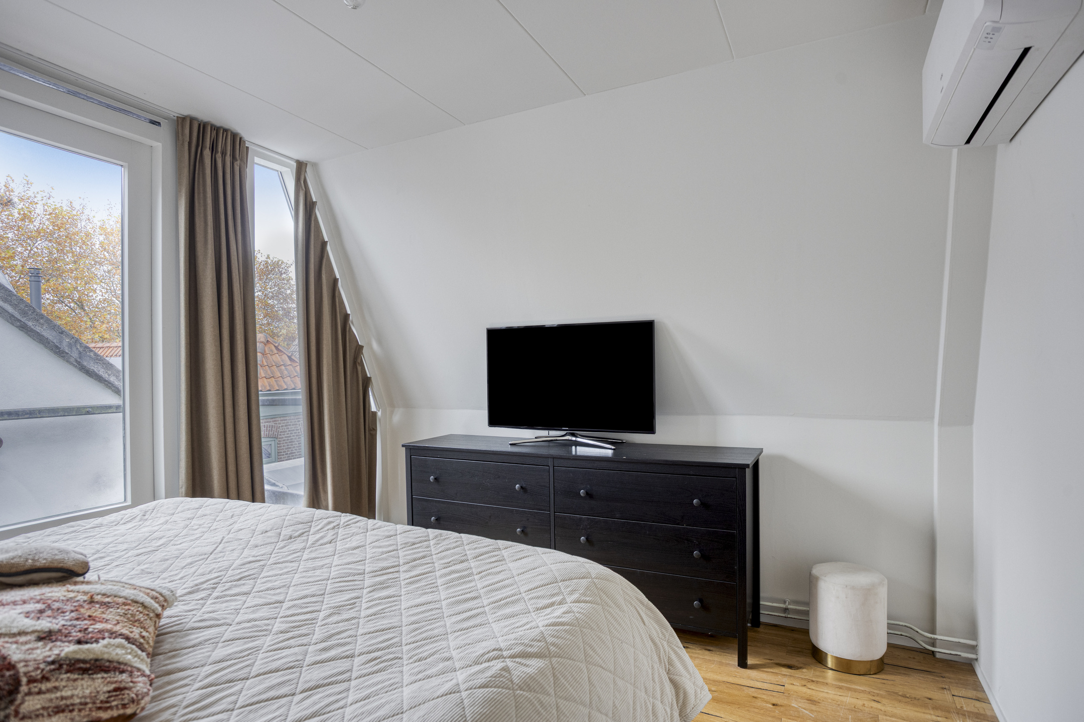 Op de tweede verdieping twee slaapkamers. De grote slaapkamer heeft een deur naar dakterras aan de voorzijde van het pand. De tweede kleinere slaapkamer ligt aan de achterzijde. Op deze verdieping treft u ook een wasruimte aan met plek voor de wasmachine, droger en omvormer voor de 3 zonnepanelen op het dak.